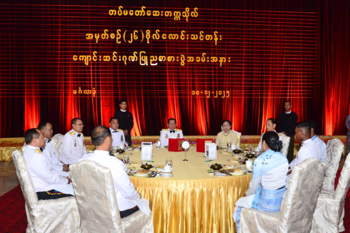 Also, present at the dinner were Daw Kyu Kyu Hla, the wife of the Senior General; Commander-in-Chief (Navy) Admiral Htein Win and his wife, Commander-in-Chief (Air) General Tun Aung and his wife, senior Tatmadaw officers from the Office of the Commander-in-Chief and their wives, Union-level dignitaries, Union ministers and their wives, commanders, the commandant of DSMA, officials from Mingaladon Station, parents and relatives of graduate officers and guests.