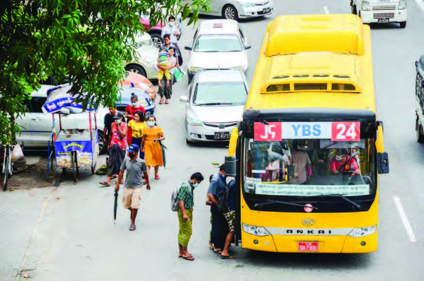 The number of commuters onboard the buses had dropped after authorities had declared the stay-at-home announcement in 44 townships in Yangon except for Cocogyun township when the COVID-19 second wave started.