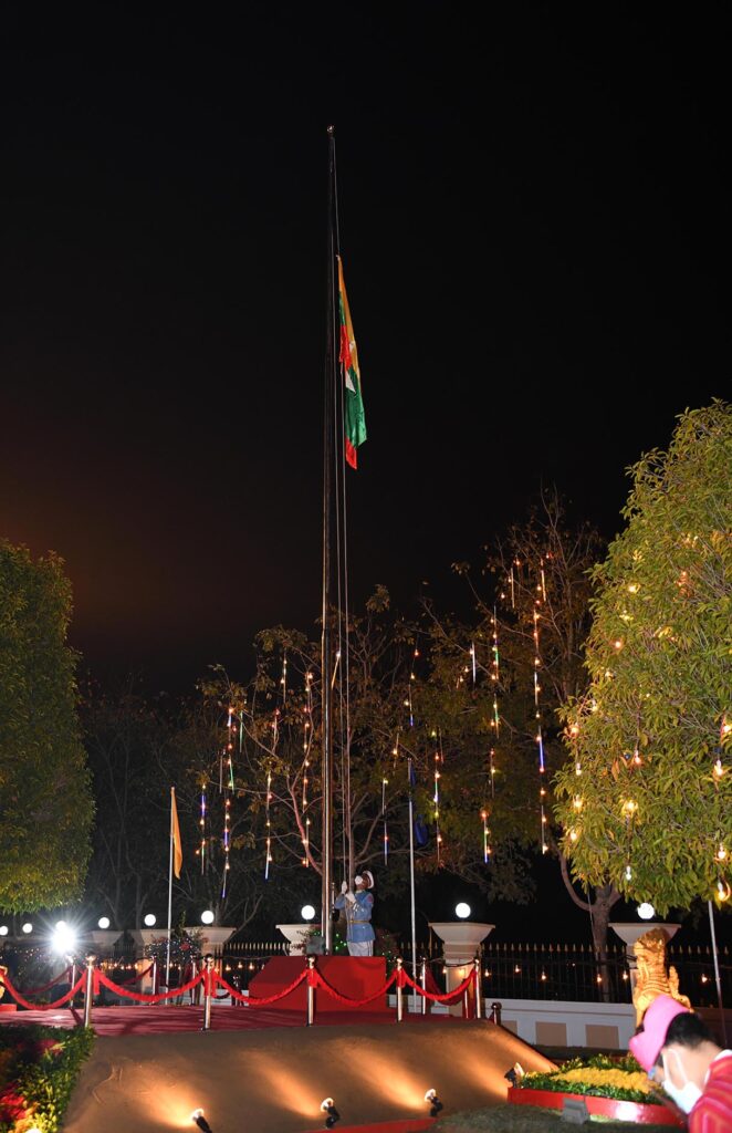 Vice-President U Myint Swe, in his capacity as chairman of Central Committee on the 73rd Independence Day celebrations, received the salute of the Guard of Honour. The Guard of Honour also saluted the nation’s martyrs and fallen soldiers and took the four-point oath.