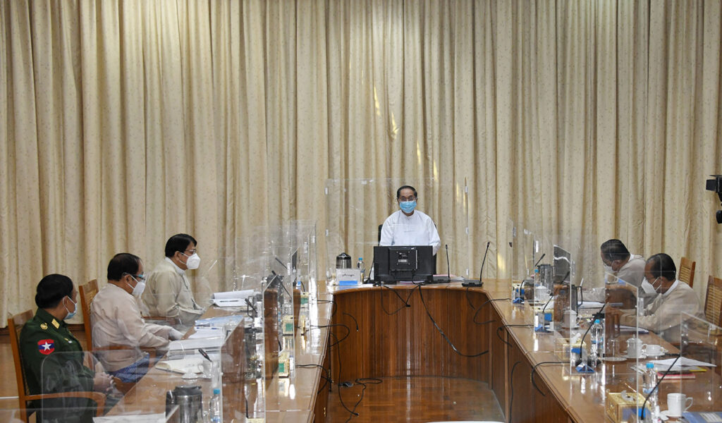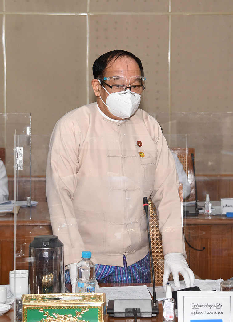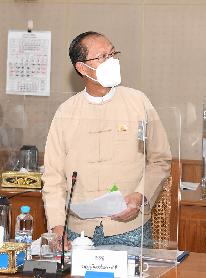 Chairman of Management Committee and Nay Pyi Taw Council Dr Myo Aung briefed on the progress in the implementation of previous decisions; Deputy Minister for Home Affairs Maj-Gen Soe Tint Naing and Deputy Chief of Myanmar Police Force Police Maj-Gen Aung Naing Thu about the security measures, Deputy Minister for Education U Win Maw Tun about preparing the President’s message, Deputy Minister for Planning, Finance and Industry U Maung Maung Win about financial matters, Nay Pyi Taw Council member U Aung Myin Tun about the invitation of guests, Deputy Commander of Nay Pyi Taw Command Col Kyaw Soe Oo about national flag hoisting and the parade of Guard of Honour, Nay Pyi Taw City Development Committee member U San Naing about erecting campaign posters, Union Minister Dr Myint Htwe about guidelines for the prevention of COVID-19, and his Permanent Secretary Dr Thet Khaing Win about the readiness of medical devices and medical tests for the staff members at the event.