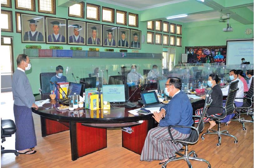 Afterwards, they arrived at the National University of Arts and Culture (Yangon).They discussed the ethnic music and ethnic dance teaching included in the university’s goal with the Rector, the Pro-Rector, Professors and Associate Professors. During the discussion, he instructed in detail the systemic teaching of ethnic music and dances.