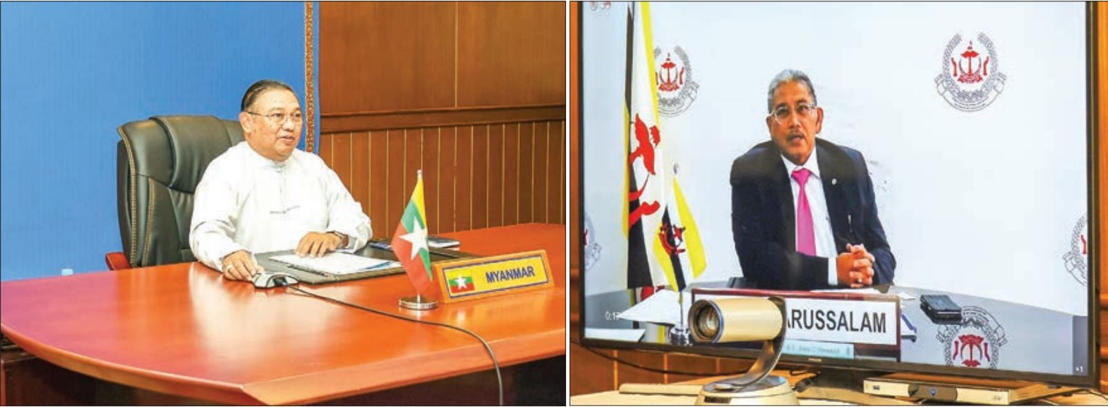 U WUNNA MAUNG LWIN, Union Minister for Foreign Affairs of the Republic of the Union of Myanmar held discussions with Dato Seri Setia Haji Erywan bin Pehin Datu Pekerma Jaya Haji Mohd. Yusof, Minister of Foreign Affairs II of Brunei Darussalam, current Chair of ASEAN, via video conference at 2:00 pm on 11 February 2021 from the Ministry of Foreign Affairs, Nay Pyi Taw.