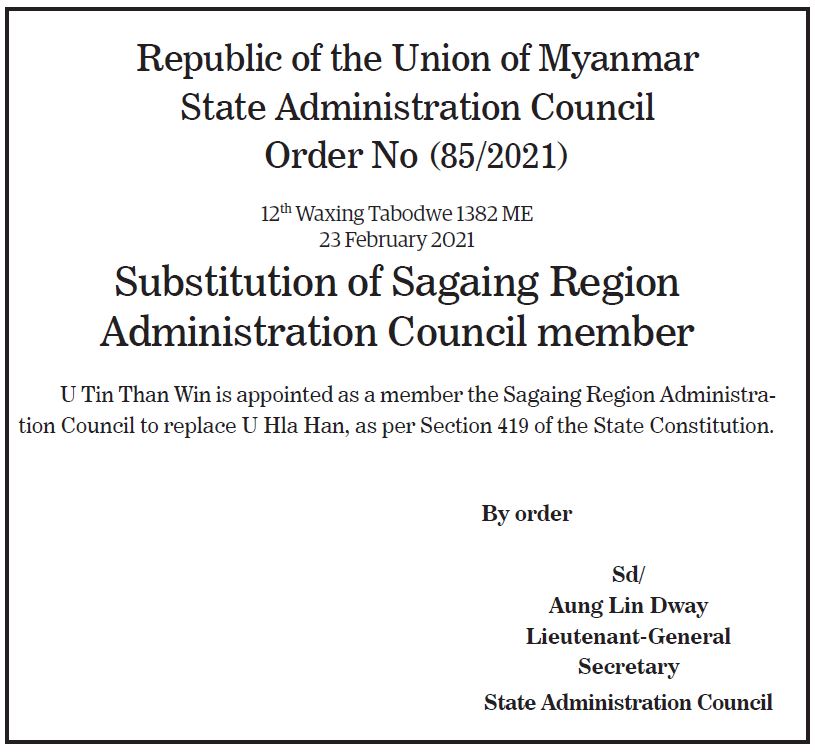 Submitted by admin on 24 February 2021 #The Global New Light of Myanmar Substitution of Sagaing Region Administration Council member