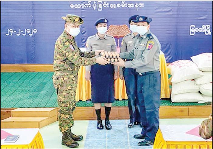 OFFICIALS of Thingan Nyi Naung region of East Command to police members in Myawady of Kayin State. The four fundamental food items of rice, cooking oil, salt and peas, and COVID-19 protective gears were distributed to family members of military personnel who sacrificed their lives for the country and Tatmadaw, military veterans, police members, militia unit members and fire brigade members. The Tatmadaw members and Myanmar Police Force members who served security measures were also supplied with medicines, food aids and awards by the respective military commands at their relevant housings and police stations. The Commander of North-East Commander Brig-Gen Hla Moe and party distributed the food aids at Khay Nin military veteran housing, Tar Pone housing in Lashio and military veteran housing in Laukkai of Shan State (North) yesterday while Commander of Triangle Region Commander Brig-Gen Myo Min Tun distributed the assistances to militia unit members at Mine Khum village of Kengtung in eastern Shan State, officials of Thingan Nyi Naung region of East Command to police members in Myawady of Kayin State, Head of Shwe Kyin Command Colonel Tin Lin Oo to militia unit members at Chay Yar Taw village of Shwe Kyin in Bago Region. Moreover, the officials also received the food aids donated by well-wishers for Tatmadaw, Myanmar Police Force and Fire Brigade members who serve security measures of the country. —MNA The Global New Light Of Myanmar