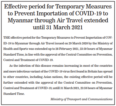 Submitted by admin on 28 February 2021 Effective period for Temporary Measures to Prevent Importation of COVID-19 to Myanmar through Air Travel extended until 31 March 2021 #The Global New Light of Myanmar