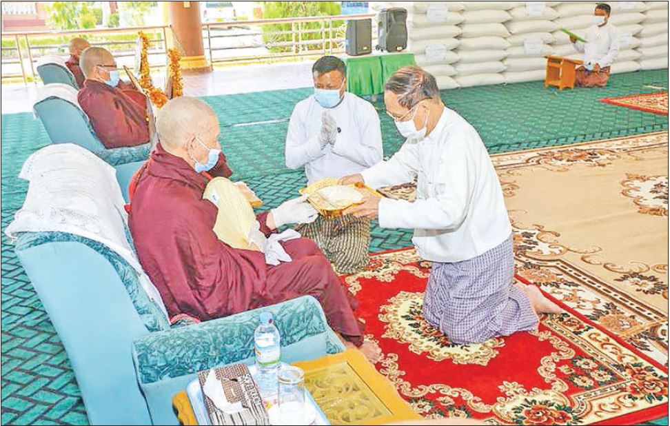 The Ministry of Religious Affairs donated a total of 214 rice bags for the 1,015 monks and 382 nuns residing in 16 monasteries and 7 nunneries in Pobbathiri Township and Pyinmana Township on 19 February. A total of 145 rice bags was presented to a total of 502 monks and 517 nuns residing in 9 monasteries and 4 nunneries in Lewe Township on 2 March 2021.