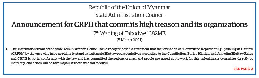 Submitted by admin on 8 March 2021 Announcement for CRPH that commits high treason and its organizations 7th Waning of Tabodwe 1382ME #TheGlobalNewLightOfMyanmar