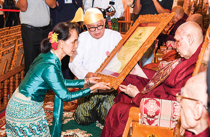 The State Counsellor also conferred the title of Abhidhaja Maharattha Guru on the leading monk of Pan Ngwe Yon monastery in Madauk Town, Nyaunglebin Township.