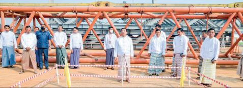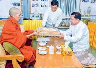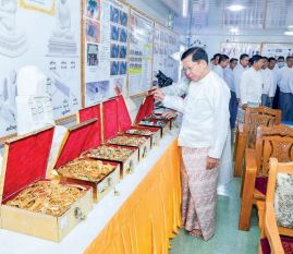 The Senior General presented offerings and cash for nine prerequisites to Ovadacariya Sayadaw of the construction of the Buddha image Pyinmana Pali Tekkatho Mingalazeyon Monastery Presiding Nayaka Agga Maha Pandita Agga Maha Saddhamma Jotikadhaja Bhaddata Vimalabuddhi and members of the Sangha. Members of the Sangha, the Senior General and well-wishers viewed the jewelled boxes of the precious jewellery items, silver coins of various countries and religious objects donated by well-wishers of the whole nation.
