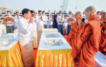 A ceremony to enshrine religious objects donated by well-wishers of the entire Republic of the Union of Myanmar led by leading donor State Administration Council Chairman Prime Minister Senior General Min Aung Hlaing took place in the centrepieces of the jewelled throne of Maravijaya Buddha image being built in Maravijaya Buddha Park in Dekkhinathiri Township of Nay Pyi Taw Union Territory yesterday morning.
