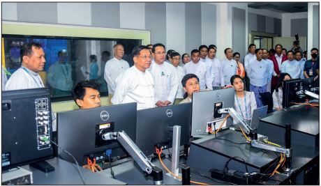The Senior General viewed round the radio broadcasting rooms, broadcasting of Myanma Radio (English FM Channel) and Thabyay Radio, Convergence News Room, news broadcasting of MRTV HD, MRTV News, Master Control Room, MRTV HD News Studio, MRTV News, Radio Tape Library, Radio News Room and Auditorium.