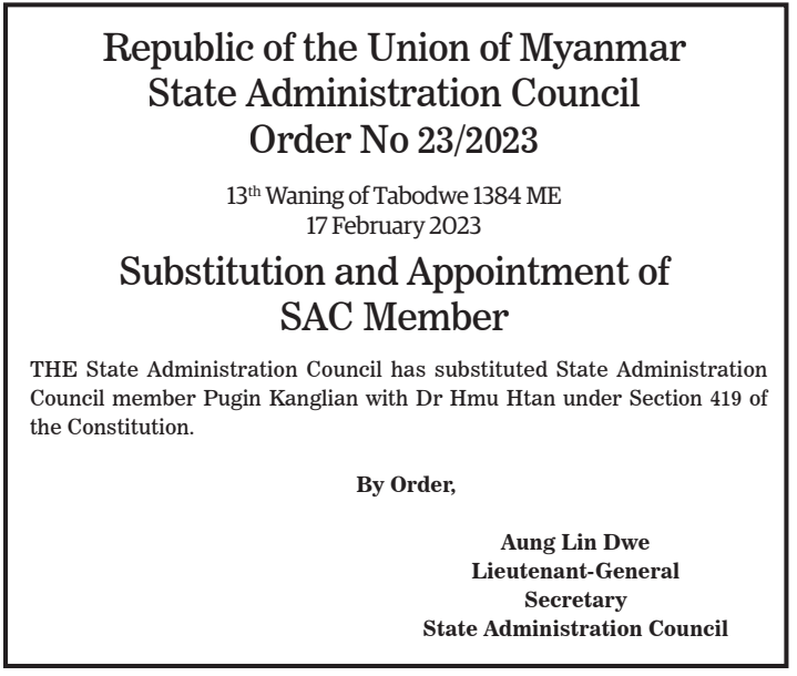 Submitted by moiuser on 18 February 2023 Republic of the Union of Myanmar State Administration Council #TheGlobalNewLightOfMyanmar
