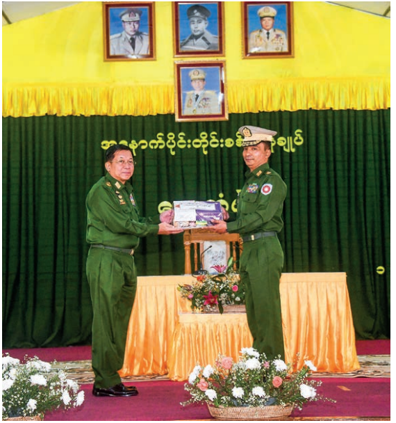 At the meeting hall, the commander of Western Command reported on undertakings of security, control of the region and rule of law, peace and stability measures, efforts for the seizure of narcotic drugs, eradication of illegal trade, sending of internally displaced persons to their natives with necessary aid, healthcare services for local people, the opening of education avenues for students to have food, clothing and shelter, and military own agriculture and livestock farms for welfare of Tatmadaw families.
