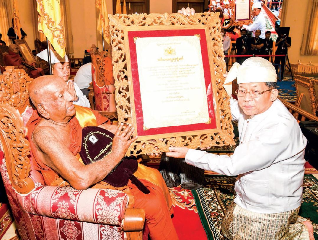 The Senior General offered Abhidhaja Maha Rattha Guru title and insignia to Most Venerable Prof. Kumburugamuwe from Sri Lanka, Somdet Phramahathirachan from Thailand and Shweminwun Sasana Yeiktha Sayadaw of Bahan Township Agga Maha Kammathanacariya Bhaddanta Sobhana on behalf of Mahasi Sayadaw Bhaddanta Sobhana.