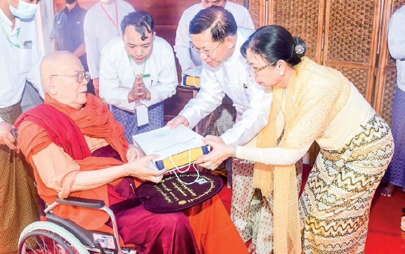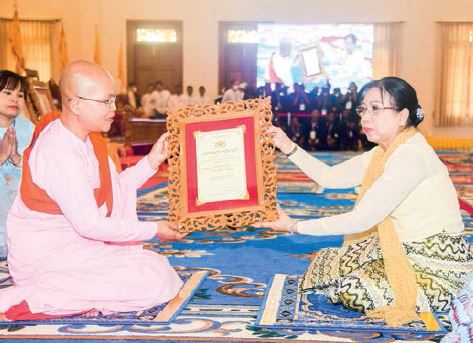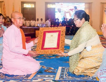 The wife of the Senior General presented Agga Maha Ganthavacaka Pandita title and insignia to Nun Daw Khemacari of Dhamma Vihari Nunnery in Aungmyethazan Township and Missionary Candarama Nunnery in Mogaung respectively and the wife of the Vice-Senior General, Agga Maha Ganthavacaka Pandita title and insignia to Nun Daw Nandamala of Khemathiri Nunnery in Magway.