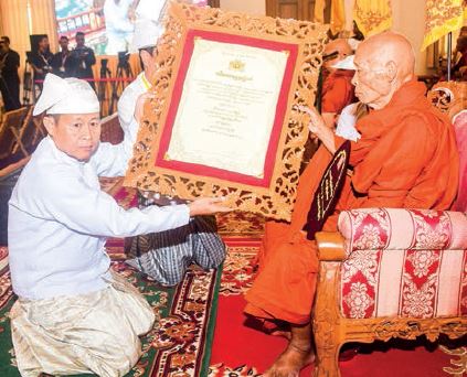 Lt-Gen Aung Lin Dwe presented Abhidhaja Maha Rattha Guru title and insignia to Sasana Mandaing Pali Tekkatho Buddhist Learning Centre of Bago Region Bhaddanta Sirinda and Lt-Gen Ye Win Oo, to Shwetaung Pali Tekkatho Monastery of Yenangyoung Township in Magway Region Bhaddanta Tejaniya.