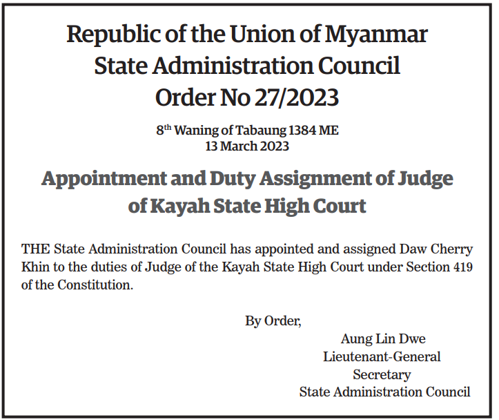 Submitted by moiuser on 14 March 2023 Appointment and Duty Assignment of Judge of Kayah State High Court #TheGlobalNewLightOfMyanmar
