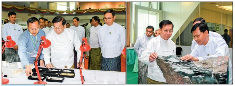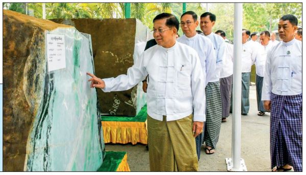 The Senior General viewed round jade, gems and pearl lots displayed for sale at the hall and gave necessary guidance to officials. The Senior General viewed round the private jewellery showrooms and looked into a 35-tonne jade stone excavated from Metlinchaung joint venture-2 in Lonkhin/Phakant gems land and lots of uncut jade stones displayed outside the hall.