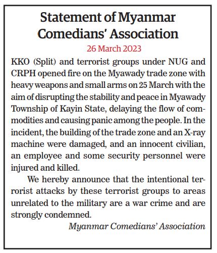 Submitted by moiuser on 27 March 2023 Statement of Myanmar Comedians’ Association #TheGlobalNewLightOfMyanmar