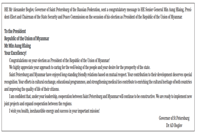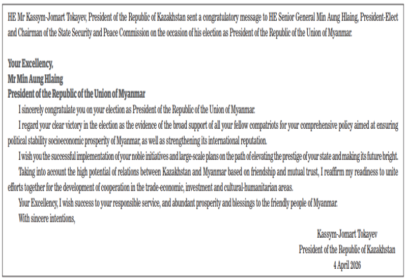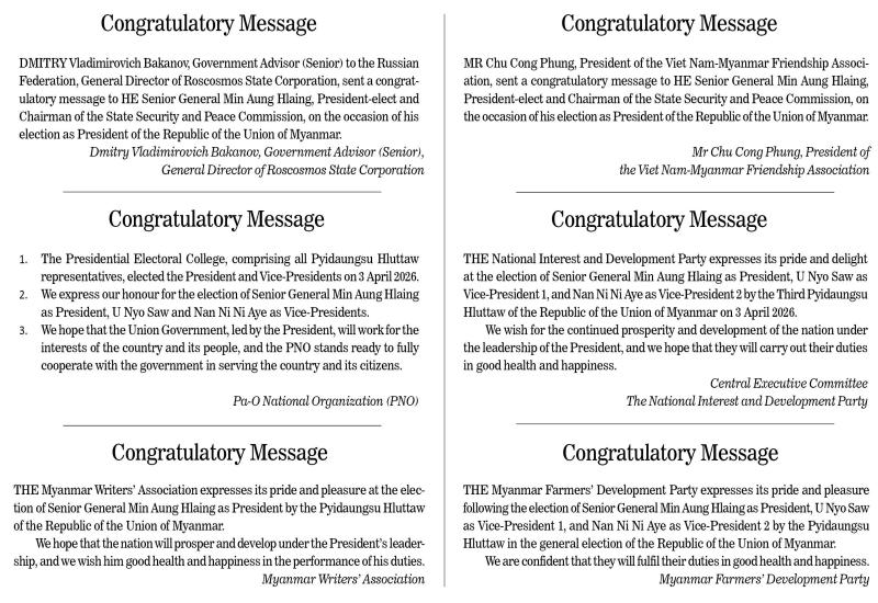 Senior General Min Aung Hlaing, selected as Vice-President by the group of elected Pyithu Hluttaw representatives, was elected as President by the Presidential Electoral College comprising all Pyidaungsu Hluttaw representatives at the presidential election on 3 April 2026. The Myanmar Farmers’ Development Party, the National Interest and Development Party, the Pa-O National Organization (PNO) and the Myanmar Writers’ Association released special congratulatory messages on the election of Senior General Min Aung Hlaing as President.