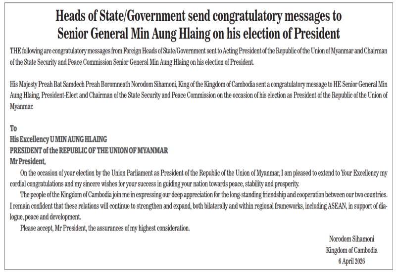Senior General Min Aung Hlaing, selected as Vice-President by the group of elected Pyithu Hluttaw representatives, was elected as President by the Presidential Electoral College comprising all Pyidaungsu Hluttaw representatives at the presidential election on 3 April 2026. Hence, the New Generation Wunthanu Party, the Myanmar Hokkien Clan Association, the Myanmar-born Chinese Charity Association, the Myanmar-Chinese Chamber of Commerce, the Myanmar Wenzhou General Chamber of Commerce, the Myanmar-Anhui Chamber of Commerce, the Yangon Yunnanese Association, the Guangdong Chamber of Commerce and Industry, the Myanmar-India Friendship Association, the Myanmar-India International Business Federation (MIIBF), the Association of Myanmar-Japan Socio-Economic Development Cooperation (AMJSEDC), the Myanmar Medical Council, the Myanmar Maternal and Child Welfare Association, the Myanmar Traditional Medical Council, the Myanmar Dental Medical Council, the Myanmar Private Hospitals Association, the Myanmar Pharmaceutical and Medical Device Manufacturer Association, the Myanmar Traditional Medicine Manufacturers and Medical Equipment Entrepreneurs Association, the Myanmar Nurse and Midwife Council, the Myanmar Red Cross Society, the Myanmar Chamber of Commerce for Pharmaceutical & Medical Device, the Myanmar Academy of Medical Sciences, the Myanmar Press Council, the Myanmar Interfaith Dialogue Group (Central), the Myanmar Motion Pictures Organization, the Islamic Religious Affairs Council Myanmar and the Myanmar Gems and Jewellery Entrepreneurs Association, the Myanmar Steel Association and the Myanmar Washu Federation issued the special congratulatory messages over the election of Senior General Min Aung Hlaing as President.