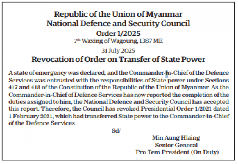 Republic of the Union of Myanmar National Defence and Security Council Order 1/2025