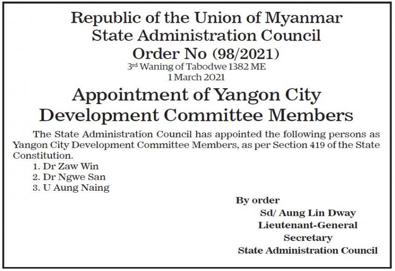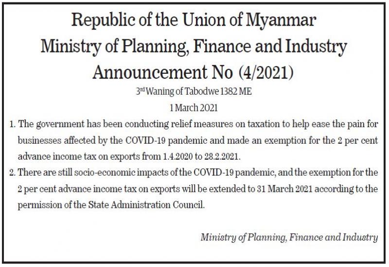 Republic of the Union of Myanmar Ministry of Planning, Finance and Industry Announcement No (4/2021)