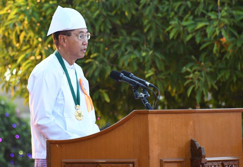 President U Win Myint delivered a speech at the ceremony conferring honorary titles at the Thabin Hall of the Presidential Palace in Nay Pyi Taw yesterday.
