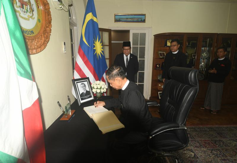 ON behalf of the Government of the Republic of the Union of Myanmar, Union Minister U Ko Ko Hlaing of the Ministry 2 at the Chairman Office of the State Administration Council signed the condolence book for the late former Malaysian Prime Minister Tun Abdullah Ahmad Badawi at the Malaysian Embassy in Yangon yesterday.