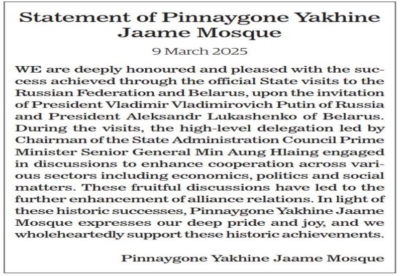 A high-level goodwill delegation led by Chairman of the State Administration Council Prime Minister Senior General Min Aung Hlaing paid official State visits to the Russian Federation at the invitation of President of the Russian Federation Vladimir Vladimirovich Putin and to the Republic of Belarus at the invitation of President of the Republic of Belarus Aleksandr Lukashenko on 3 March 2025 and could hold meetings to achieve positive results for Myanmar.