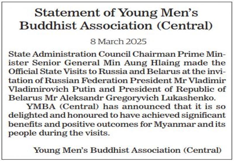 A high-level goodwill delegation led by Chairman of the State Administration Council Prime Minister Senior General Min Aung Hlaing paid official State visits to the Russian Federation at the invitation of President of the Russian Federation Vladimir Vladimirovich Putin and to the Republic of Belarus at the invitation of President of the Republic of Belarus Aleksandr Lukashenko on 3 March 2025 and could hold meetings to achieve positive results for Myanmar.