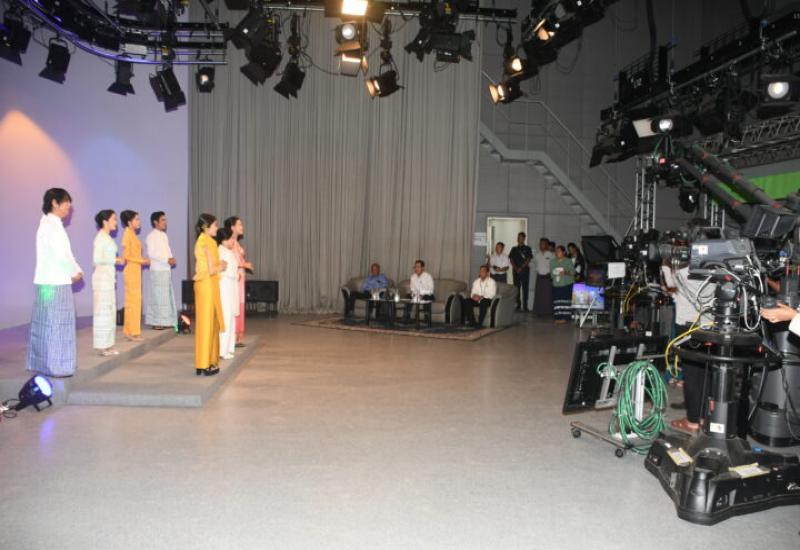 Union Minister for Information U Maung Maung Ohn watched the filming processes of the Myanmar Music Association (Central) for awareness songs to promote a successful election for the 2025 multiparty democracy general election at MRTV in Yangon yesterday.