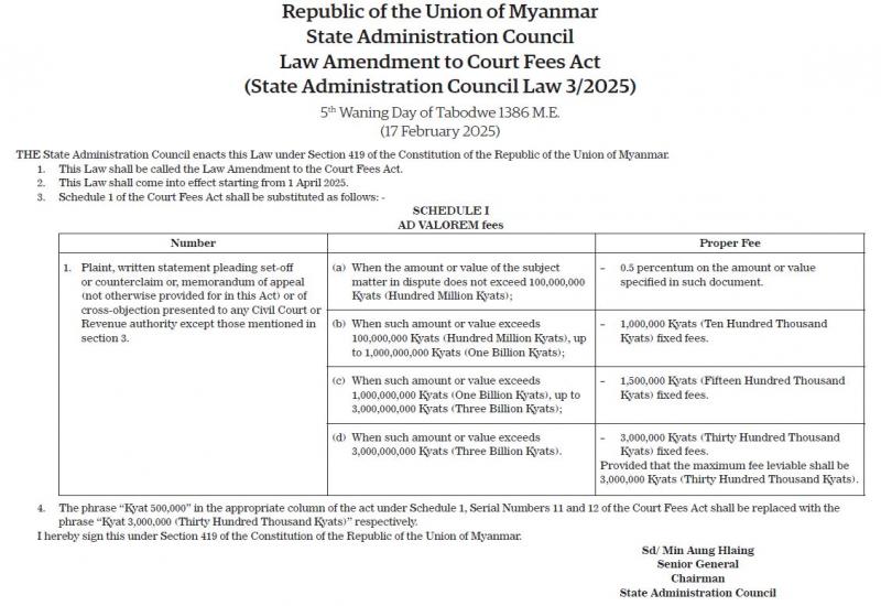 THE State Administration Council issued the Law Amendment to Court Fees Act as Law No 3/2025 of the SAC on 17 February 2025. The law will come into effect starting from 1 April 2025.