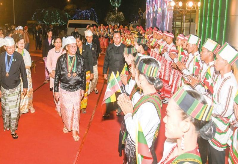 Chairman of the State Administration Council Prime Minister of the Republic of the Union of Myanmar Senior General Thadoe Maha Thray Sithu Thadoe Thiri Thudhamma Min Aung Hlaing and his wife Daw Kyu Kyu Hla hosted a dinner in honour of the 78th Anniversary of Union Day 2025 at the square of the City Hall in Nay Pyi Taw yesterday evening.