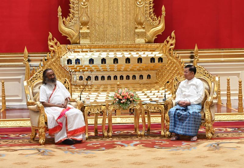 Chairman of the State Administration Council Prime Minister Senior General Min Aung Hlaing received Indian Gurudev Sri Sri Ravi Shankar, the humanitarian leader and peace envoy, at the Credentials Hall of the Office of the SAC Chairman in Nay Pyi Taw yesterday morning.