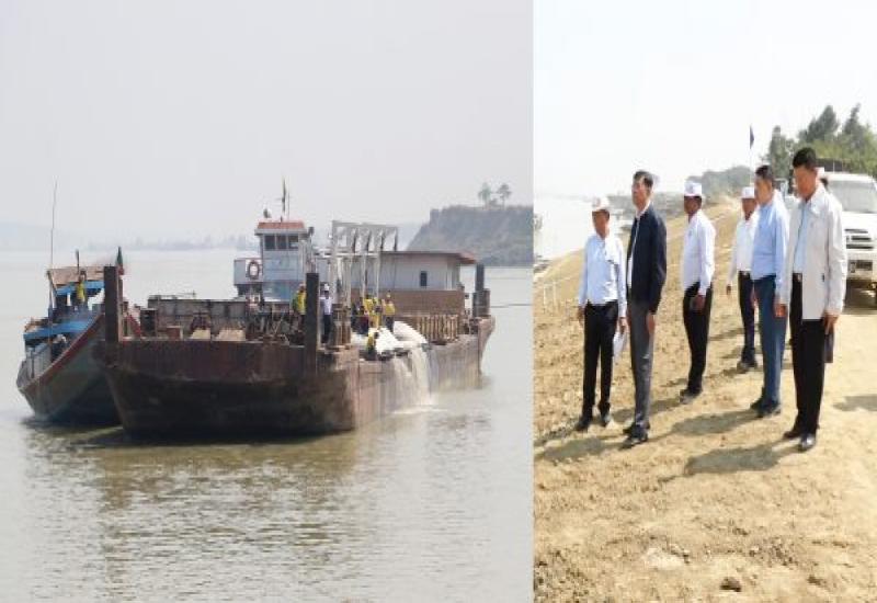 Member of the State Administration Council, Deputy Prime Minister and Union Minister for Transport and Communications General Mya Tun Oo, along with the Chief Minister of Ayeyawady Region, the Regional Minister for Transport and Communications, and other officials, inspected the construction of embankments, dredging works to prevent erosion and landslides in the villages, and flood protection works in Eaikpyat Village-tract on the banks of the Ayeyawady River in Hinthada Township, Ayeyawady Region, yesterday.