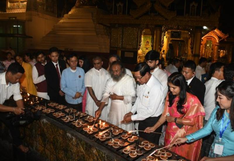 Indian Gurudev Sri Sri Ravi Shankar, the humanitarian leader and peace envoy, currently in Yangon, met with the business people at the Grand Ballroom of Chatrium Hotel in Yangon yesterday and discussed the inner pace practices.