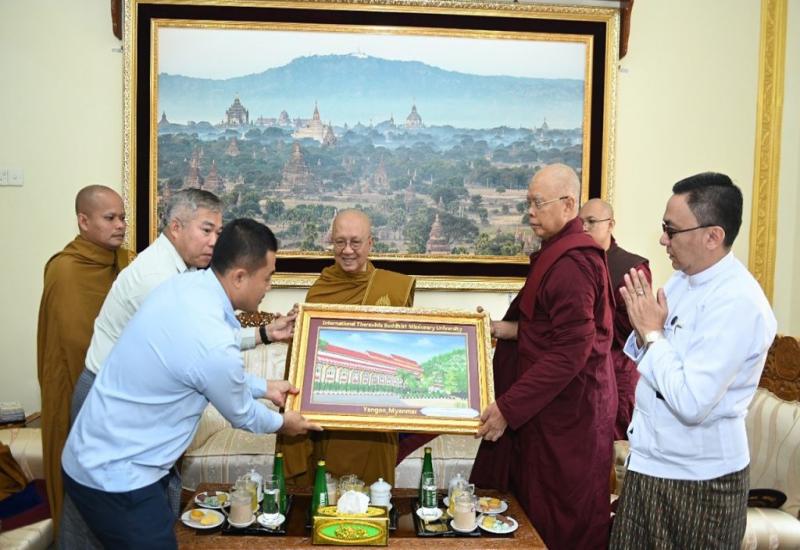 The members of the Sangha led by His Holiness Samdech Preah Abhisiri Sugandha Mohasangharajah Dhipati Dr Bour Kry from Dhammayuttika Nikaya who is one of the Adhipati Sayadaws in Cambodia, currently in Myanmar, visited the International Theravada Buddhist Missionary University, in Yangon yesterday.