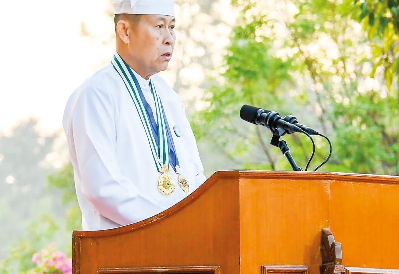 State Administration Council Chairman Commander-in-Chief of Defence Services Senior General Thadoe Maha Thray Sithu Thadoe Thiri Thudhamma Min Aung Hlaing delivered an address at the ceremony to present honourary medals to winners at Zeyathiri Beikman in Nay Pyi Taw yesterday afternoon.