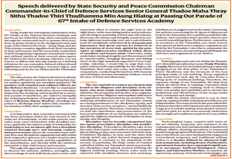 THE 70th Graduation Ceremony of the Defence Services Academy was held yesterday morning at the Convocation Hall of the Academy. Commandant of the Defence Services Academy Brig-Gen Thura Zaw Lin Soe, Rector Brig-Gen Thein Lwin, members of the Faculties and families of graduate cadets attended the ceremony.