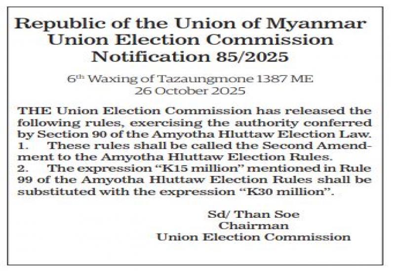 THE campaign speeches of political parties participating in the multiparty democratic general election, scheduled to be held on 28 December 2025, will be broadcast at 7 pm beginning on 28 October, through MRTV HD, MRTV Parliament, and affiliated television channels, including MWD HD and MWD Variety HD, as well as on Myanmar Radio, Thapyay Radio, Thazin FM, and online platforms such as the MRTV App, Radio App, and other MRTV online platforms.