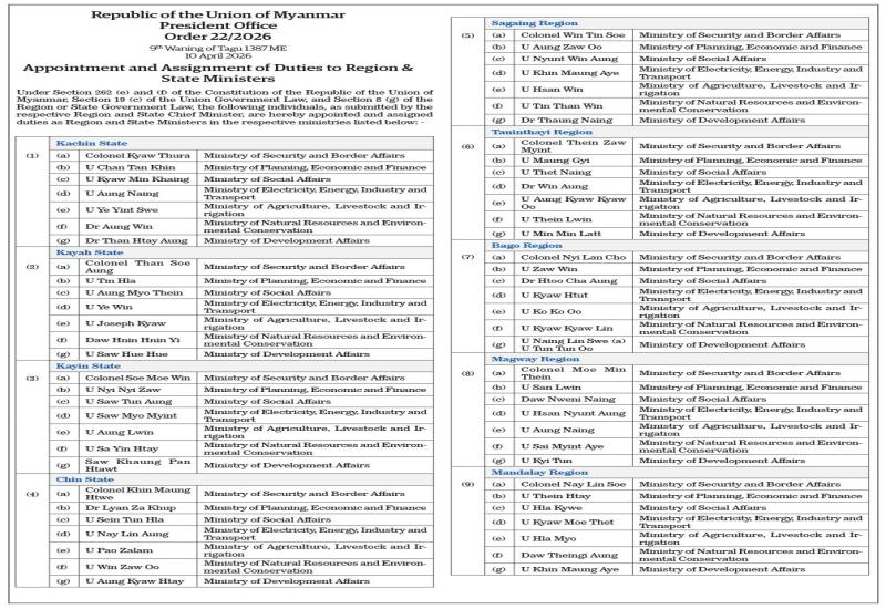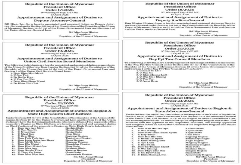 Republic of the Union of Myanmar President Office Order 1/2026 – Order 16/2026