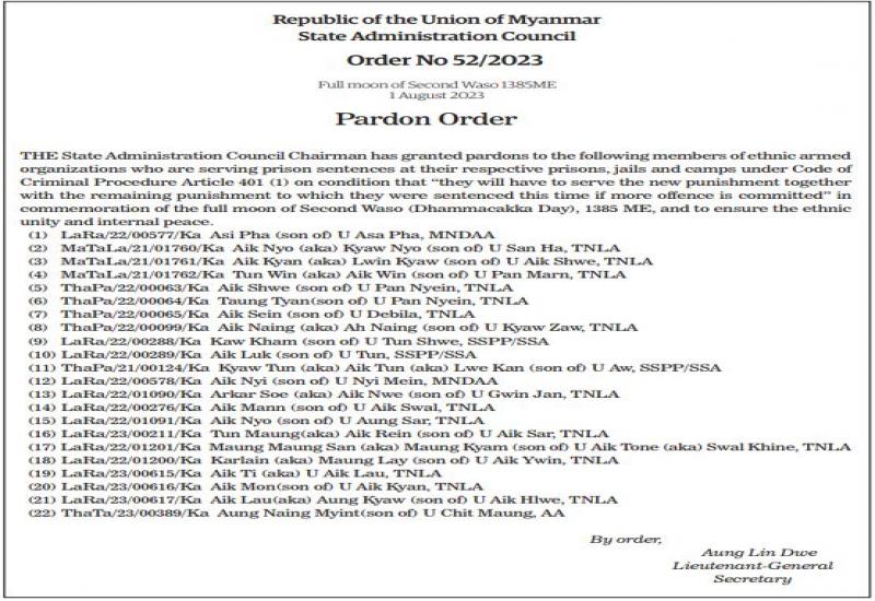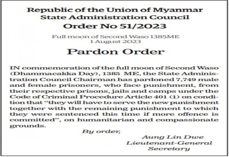 1. The Chairman of the State Administration Council issued Order No 48/2023, 49/2023, 50/2023, 51/2023, 52/2023, 53/2023, and 54/2023 on 1 August 2023, in commemoration of the full moon of Second Waso (Dhammacakka Day), 1385 ME, in the interest of public peace of mind and on compassionate grounds, national solidarity, internal peace and in consideration of the friendly relations between countries.