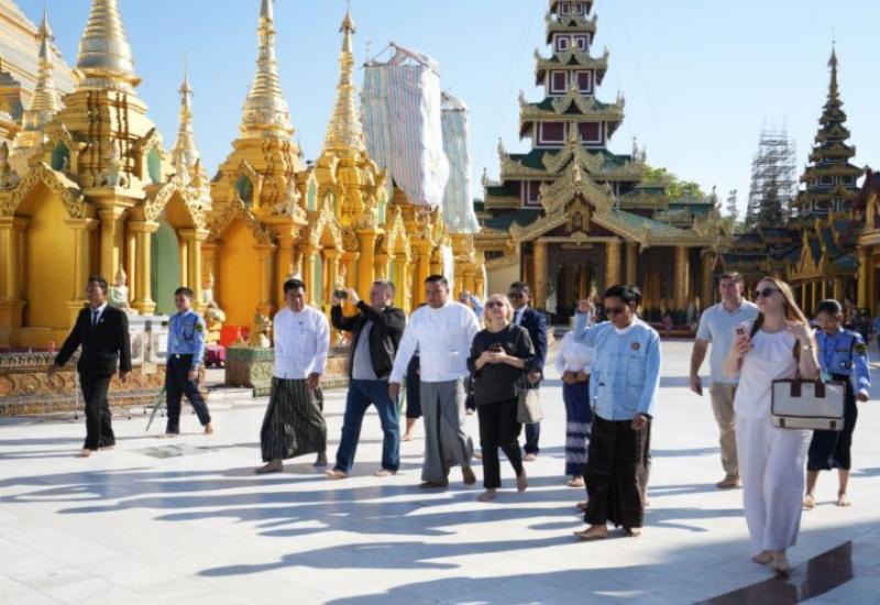 Minister of Industry of the Republic of Belarus Mr Andrei Kuzniatsou, Minister of Agriculture and Food Mr Yury Horlau, Minister of Health Mr Aliaksandr Khajayeu, Chairperson of the Belarusian State Concern for Production and Sale of Light Industry Goods (Bellegprom) Ms Nadzeya Lazarevich, and the delegation, along with officials from the Ministry of Foreign Affairs (Yangon), arrived at the Shwedagon Pagoda yesterday afternoon and were welcomed by Yangon Region Minister for Social Affairs U Htay Aung and members of the Shwedagon Pagoda Board of Trustees.