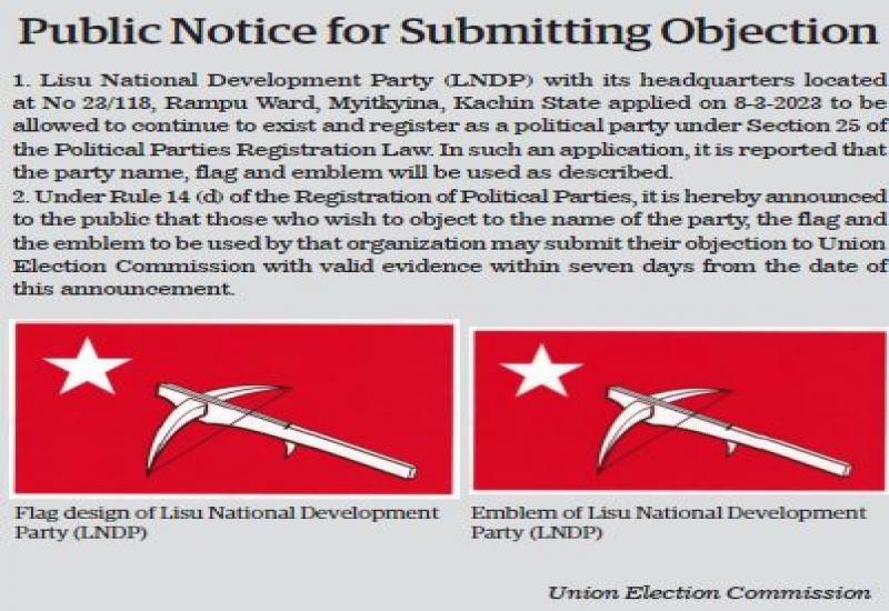 UNDER Section 25 of the Political Parties Registration Act, Lisu National Development Party (LNDP) which is desirous of organizing a political party and Tai-Leng Nationalities Development Party (TNDP) which is desirous of organizing a political party yesterday applied to the Union Election Commission for permissions to establish political parties under the law and rules.