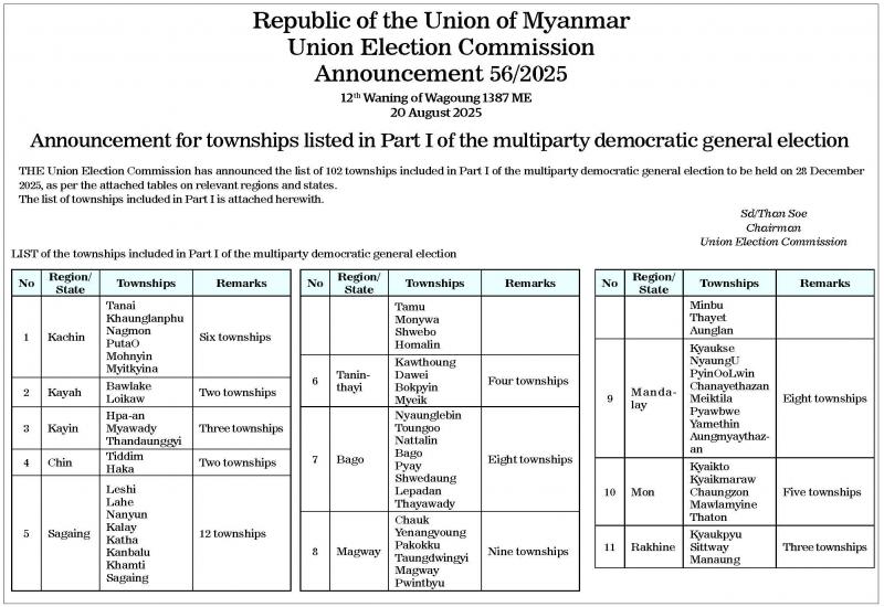Republic of the Union of Myanmar Union Election Commission Announcement 56/2025