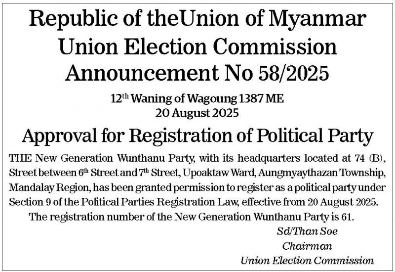 Republic of the Union of Myanmar Union Election Commission Announcement 58/2025