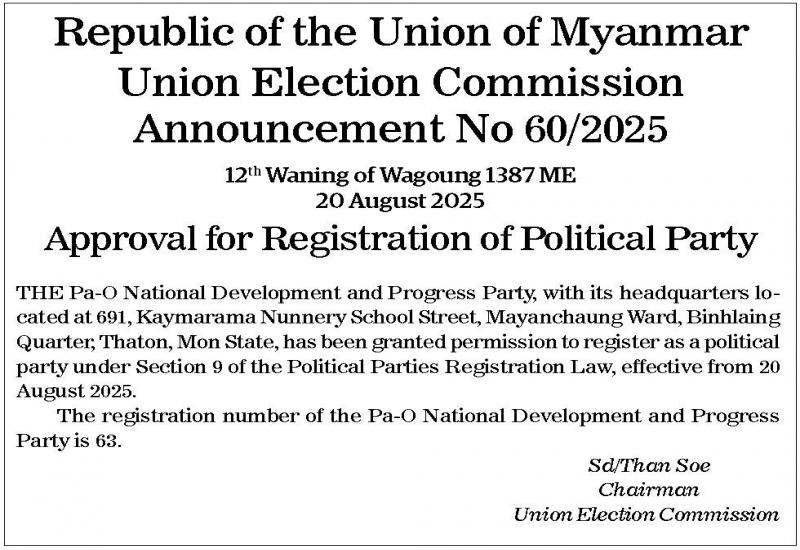 Republic of theUnion of Myanmar Union Election Commission Announcement No 60/2025
