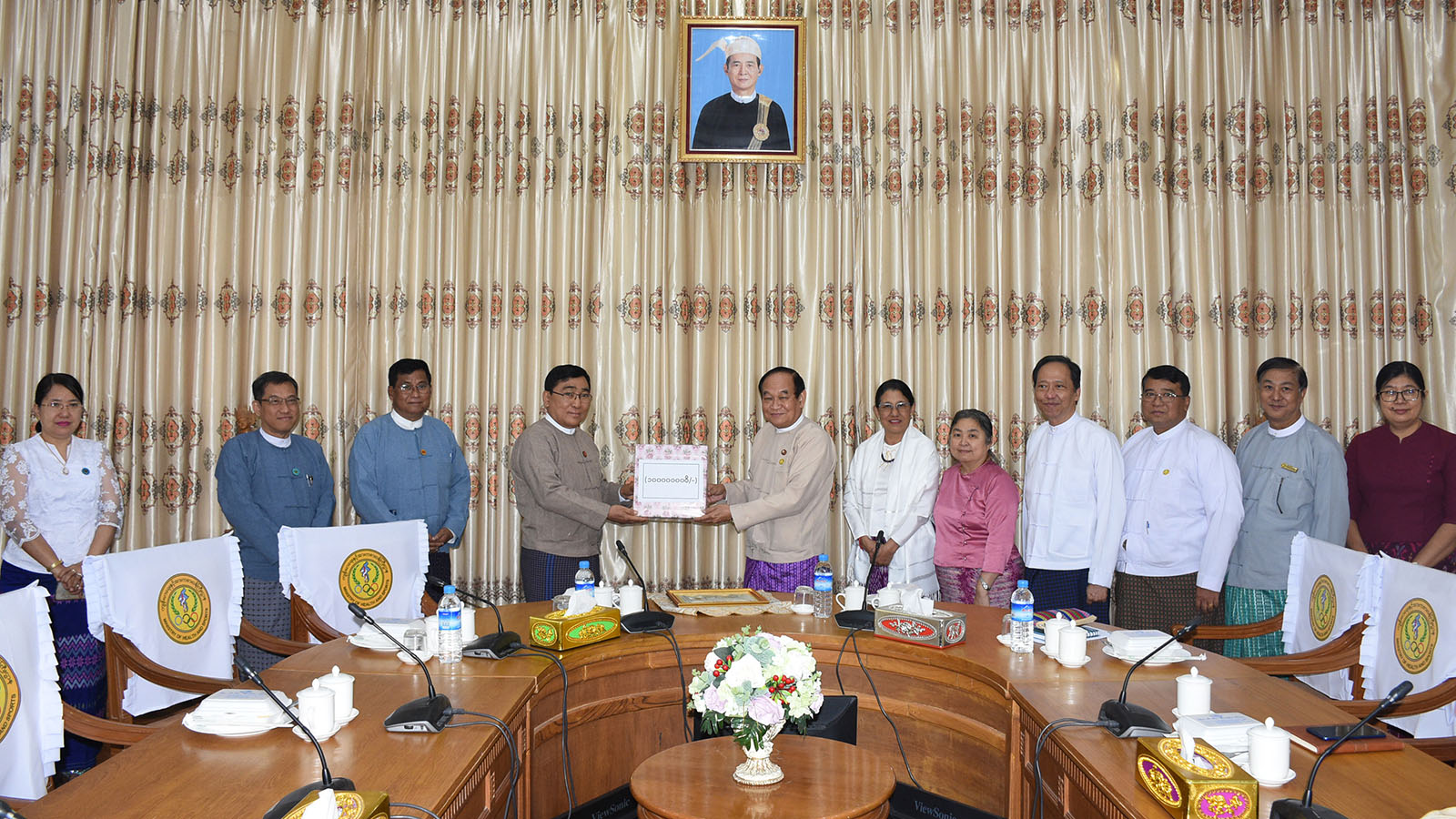 Union Minister for Social Welfare, Relief and Resettlement Dr Win Myat Aye, the vice-chairman of disaster management committee, presented the cash donation to Union Minister for Health and Sports Dr Myint Htwe, the secretary (2) of central committee.