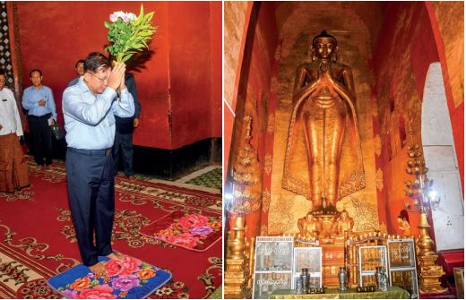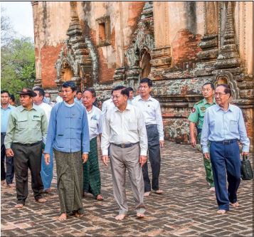 Yesterday morning, the Sen[1]ior General inspected inunda[1]tion, loss and damage at Ananda Temple, Htilominlo Pagoda and Shwezigon Pagoda in Bagan an[1]cient cultural zone.